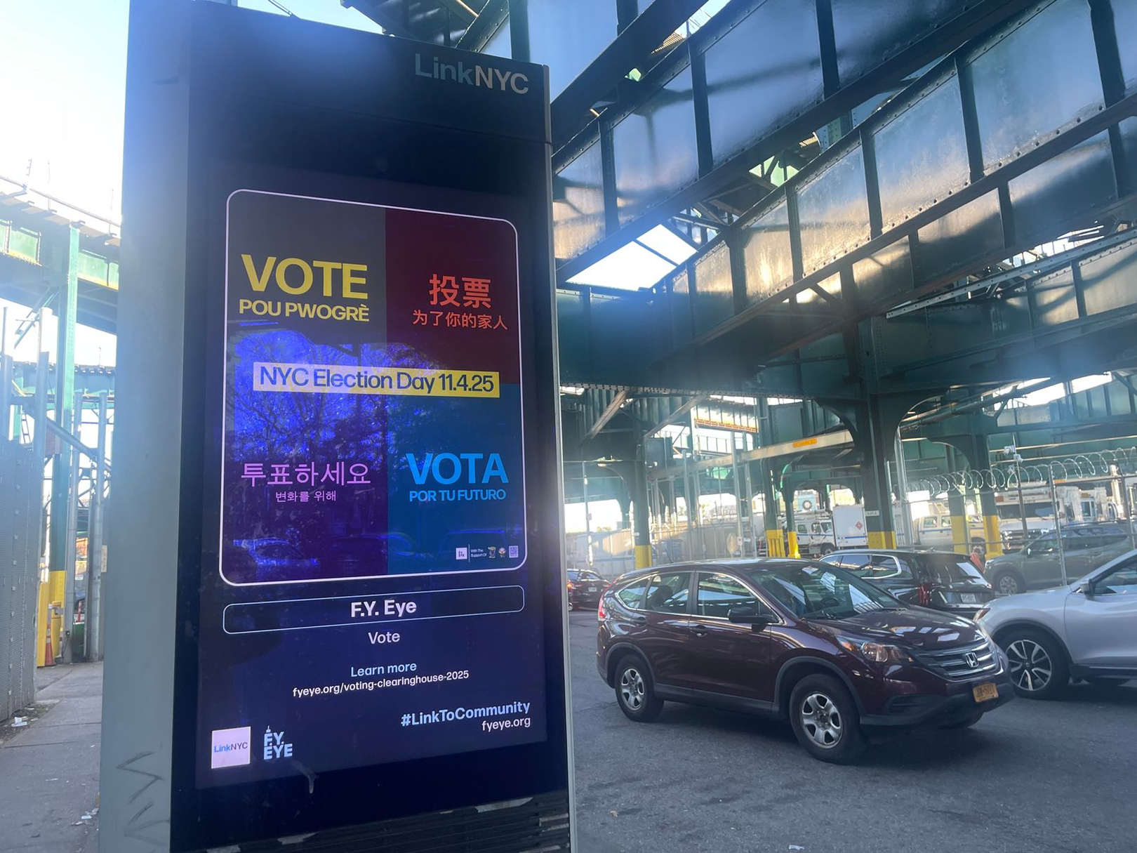 During election cycles, F.Y. Eye works with media vendors across NYC to secure donated advertising space and amplify nonpartisan civic engagement PSAs – from lobby and elevator screens across the city, to wheat pasted posters, billboards in high visibility areas, and digital kiosks in low voter turnout communities.